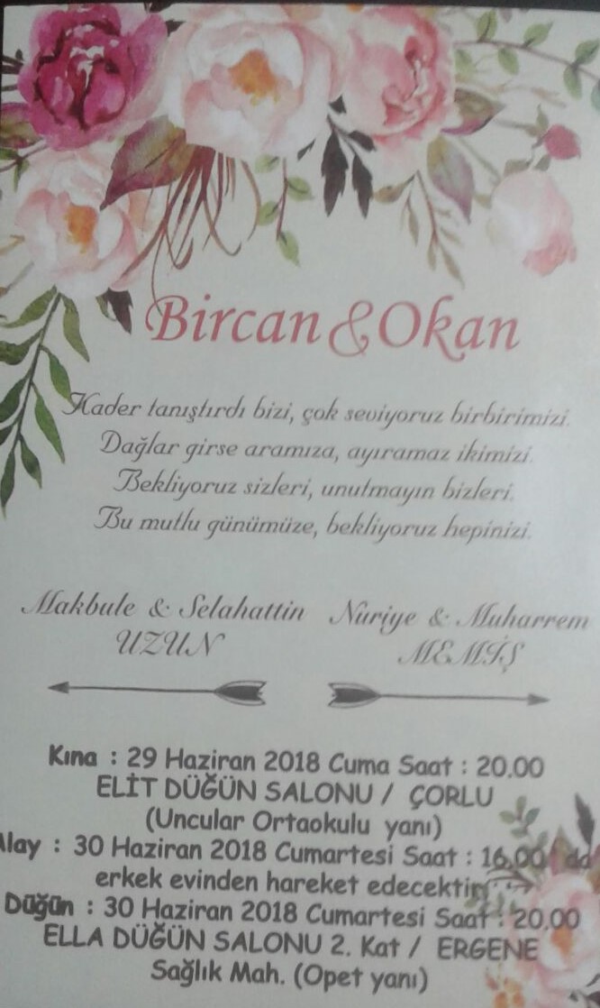 Köyümüz halkından Makbule & Selahattin Uzun’un kızı Bircan ile Okan’ın düğün törenleri 30 Haziran 2018 Cumartesi günü saat 20:00 24:00 arası Ella Düğün Salonu 2 (Opet Yanı) Ergene/TEKİRDAĞ adresinde yapılacaktır. Düğüne tüm üyelerimiz ve köy halkımız davetlidir.