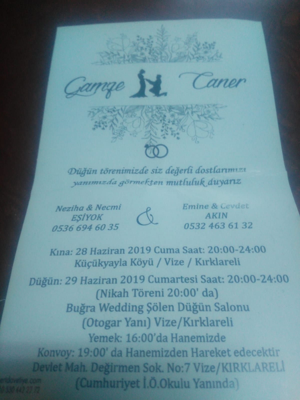Köyümüz halkından Neziha&Necmi Eşiyok’un kızı Gamze ile Caner’in düğün törenleri 29 Haziran 2019 Cumartesi akşamı saat: 20.00 24.00 arası Buğra Wedding Sölen düğün salonu Vize / Kirklareli adresinde yapılacaktır. Düğüne tüm üyelerimiz ve halkımız davetlidir.
