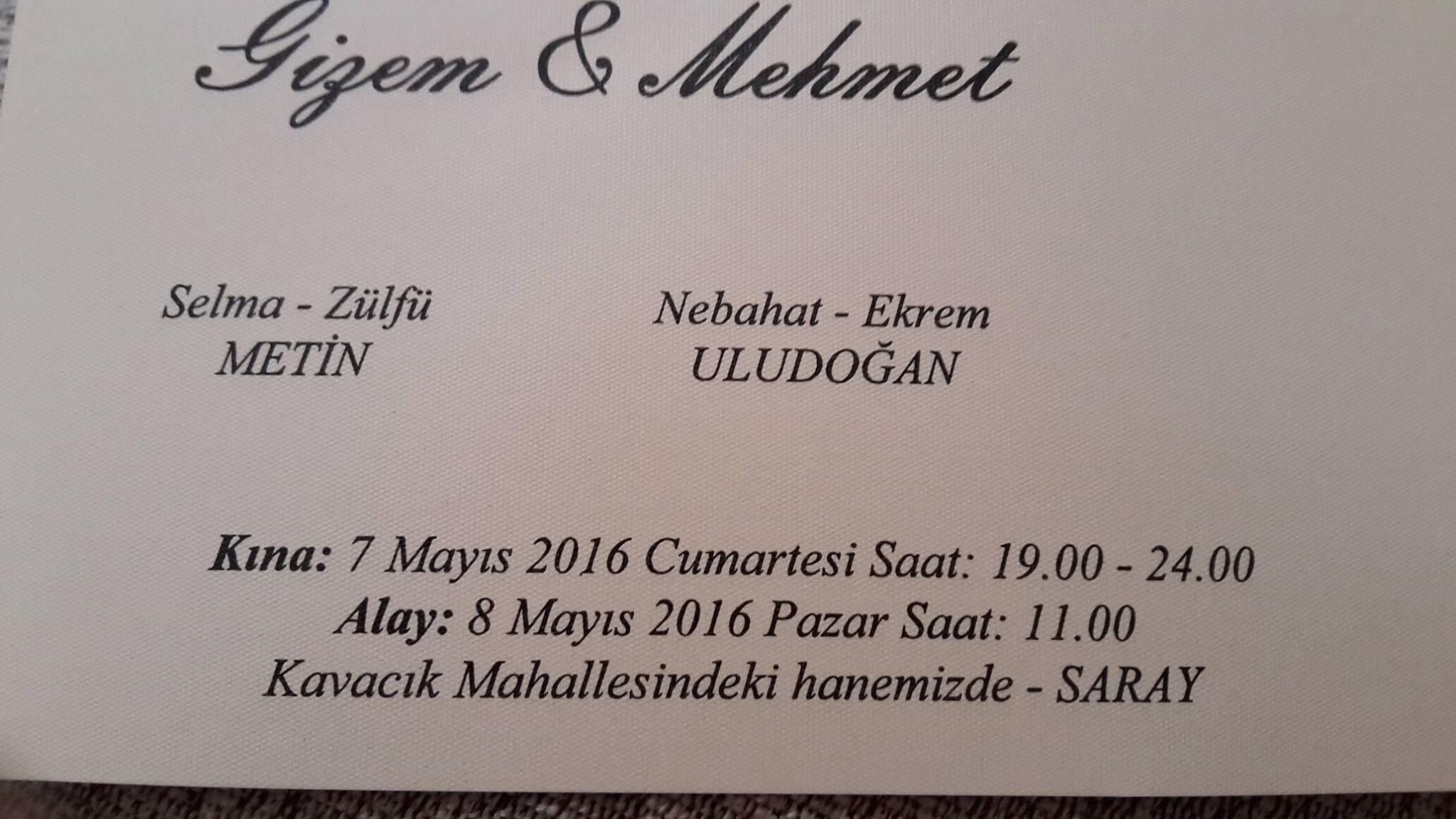 Düğün HaberleriKüçükyayla Haber Düğüne Davet Gizem ve Mehmet (Selma Karakaş) Yazar admin - 4 Mayıs 2016 0 473 FacebookTwitterPinterestWhatsAppEmailYazdır