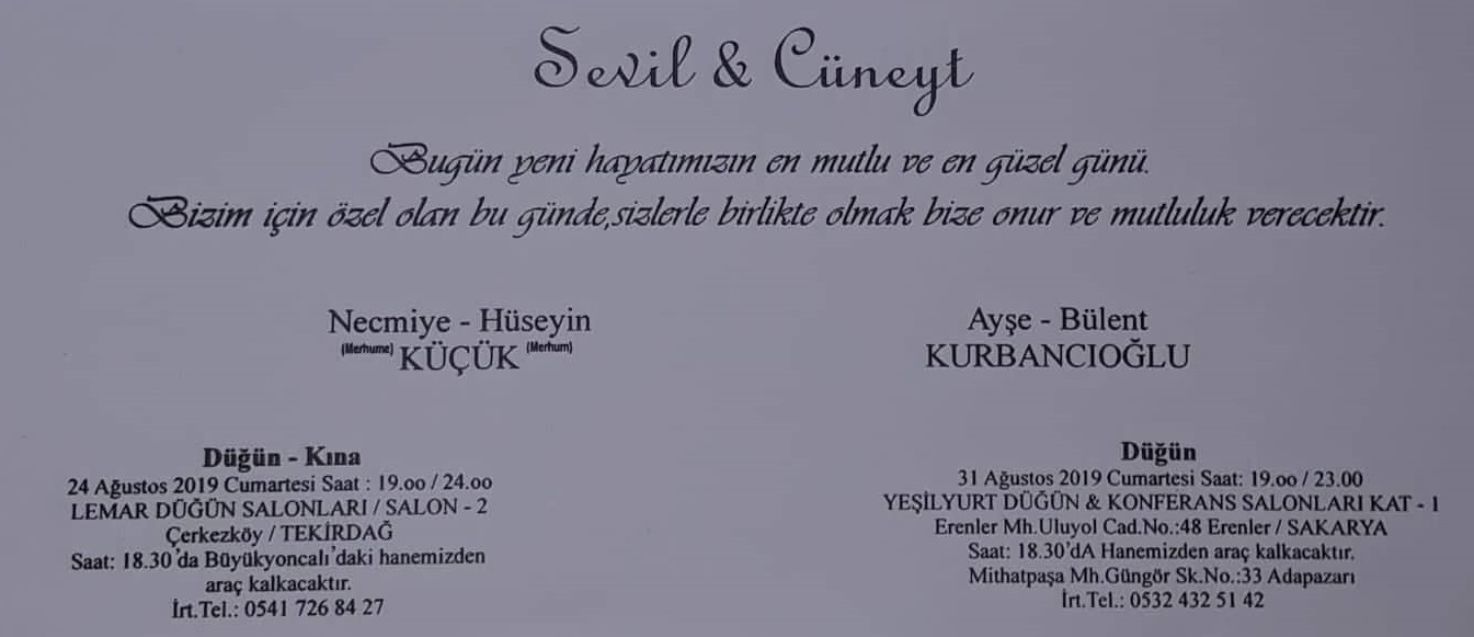 Köyümüz halkindan Merhum Hüseyin& merhume Necmiye Kücük (Katrancı Hüseyin)’in kızı Sevil ve Cüneyt’in düğünleri 24 Ağustos 2019 Cumartesi saat: 19.00 24.00 arası Lemar Düğün Salonu – 2 Çerkezköy / Tekirdağ adresinde yapılacaktır. düğüne tüm üyelerimiz ve halkımız davetlidir.