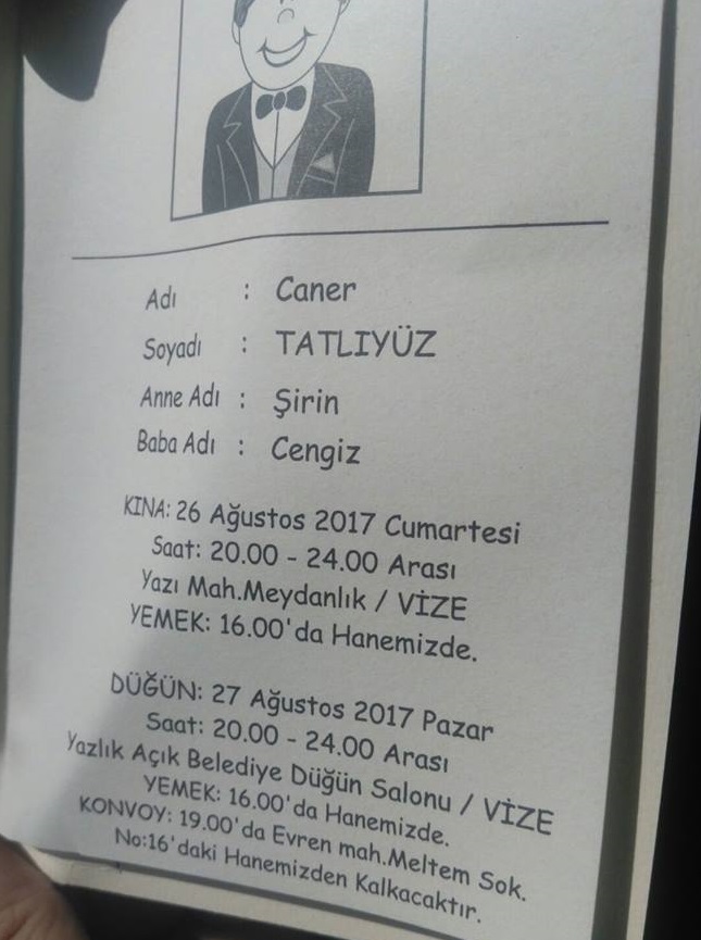 Düğün HaberleriKüçükyayla Haber Düğüne Davet (Şirin-Cengiz Tatlıyüz’ün Oğlu Caner ve Meltem) Yazar admin - 24 Ağustos 2017 0 361 FacebookTwitterPinterestWhatsAppEmailYazdır Köyümüz Halkından Şirin-Cengiz Tatlıyüz’ün Oğlu Caner ve Meltem’in düğün törenleri 27 Ağustos 2017 Pazar günü saat 20:00 24:00 arası Yazlık Açık Belediye Düğün Salonu / VİZE adresinde yapılacaktır. Düğün Törenine tüm halkımız davetlidir.