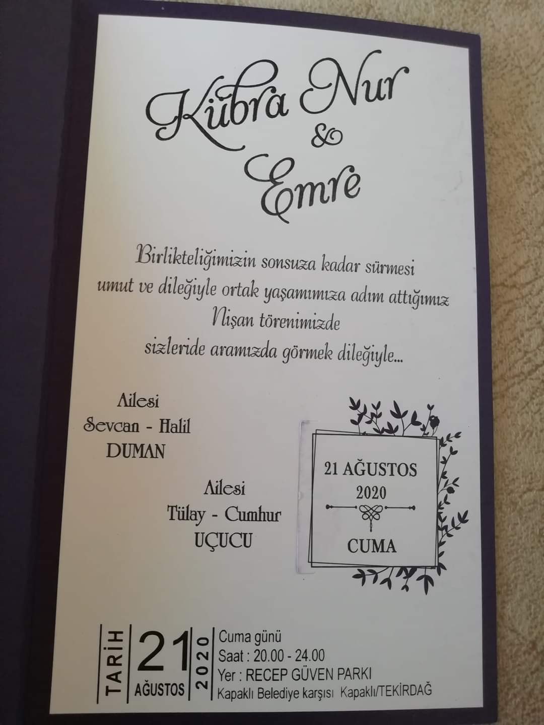 Küçükyayla Haber Nişana Davet (Kübra Nur&Emre) Yazar admin - 18 Ağustos 2020 0 322 FacebookTwitterPinterestWhatsAppEmailYazdır Köyümüz halkından Sevcan&Halil Duman’ın kızı Kübra Nur ile Emre’nin nişan törenleri 21 Ağustos 2020 saat 20.00 de Recep Güven Parkı Kapaklı/Tekirdağ adresinde yapılacaktır. Nişana tüm köy halkımız ve üyelerimiz davetlidir.