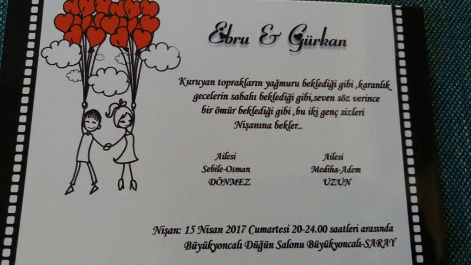 Köyümüz halkından Osman Dönmez’in Kızı Ebru ve Gürkan’ın nişan törenleri 15 Nisan 2017 Cumartesi günü saat 20:00 24:00 arası Büyükyoncalı Düğün Salonunda Büyükyoncalı/Saray adresinde yapılacaktır. Nişanımıza Tüm Dernek üyelerimiz ve Köy Halkımız davetlidir. İrtibat Osman Dönmez 05355539236