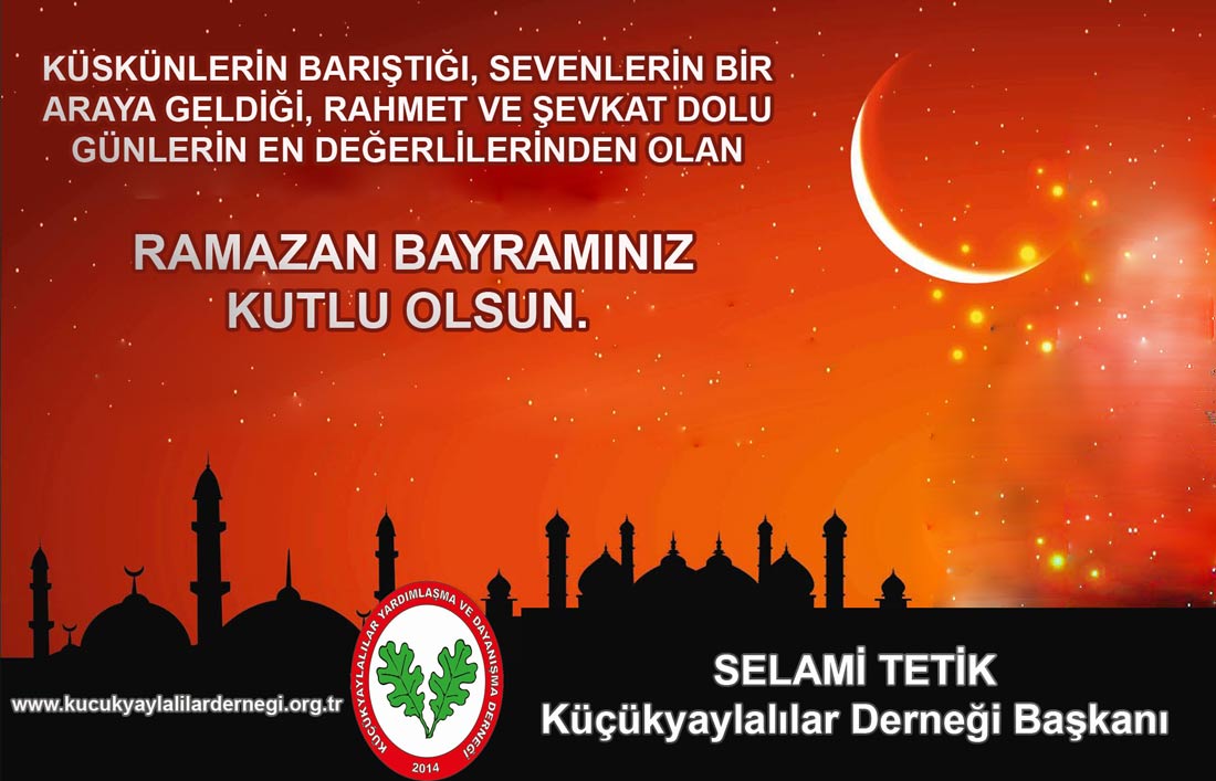 Küçükyayla Haber Ramazan Bayramınız Kutlu Olsun. Yazar admin - 14 Haziran 2018 0 397 FacebookTwitterPinterestWhatsAppEmailYazdır Küskünlerin barıştığı, sevenlerin bir araya geldiği, rahmet ve şevkat dolu günlerin en değerlilerinden olan Ramazan Bayramınız Kutlu Olsun. Selami TETİK Küçükyaylalılar Derneği Başkanı