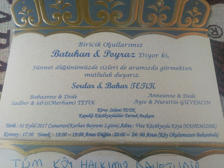 Köyümüz Halkından Bahar-Serdar Tetik’in oğulları, Dernek Başkanımız Selami Tetik’in Yeğenleri Batuhan ve Poyraz’ın sünnet düğünleri 2 Eylül 2017 Cumartesi Saat: 20:00 24:00 arası Küçükyayla Köyü / Vize Adresinde yapılacaktır. Ayrıca Kirveliğini Dernek Başkanımız Selami Tetik’in yapacağı sünnet düğününe tüm Dernek üyelerimiz ve Köy Halkımız davetlidir.