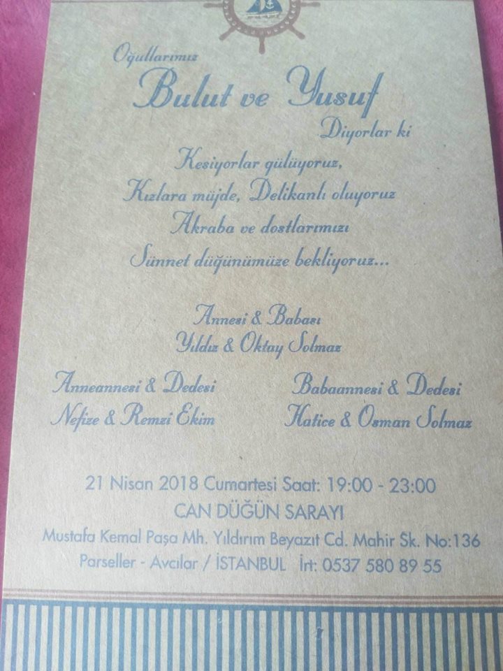 Köyümüz Halkından Yıldız Oktay Solmaz Oğulları, Nefise Remzi Ekim Torunları Bulut ve Yusuf’un sünnet düğünleri 21 Nisan 2018 Cumartesi günü Saat 20:00 24:00 arası Can Düğün Sarayı M.Kemal Paşa Mah.Yıldırım Beyazıt Cad.Mahir Sk.No:136 Parseller/Avcılar adresinde yapılacaktır. Sünnete tüm köy halkımız ve üyelerimiz davetlidir. İrtibat No: 05355415336 (Remzi Ekim)