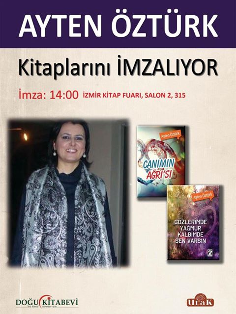 Küçükyayla Haber Yazarımız Ayten Öztürk İzmir Kitap Fuarında Yazar admin - 26 Nisan 2017 0 239 FacebookTwitterPinterestWhatsAppEmailYazdır Yazarımız Ayten Öztürk İzmir Kitap Fuarında kitaplarını imzalıyor. O bölgede bulunan üyelerimizin katılımlarını bekliyoruz. Ayten Öztürk İzmir Kitap Fuarı imza günü 29 Nisan 2017 Cumartesi günü saat:14:00 de gerçekleştirilecektir.